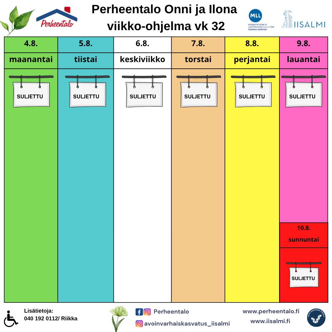 Perheentalon viikko-ohjelma vk 32. Perheentalo suljettu.