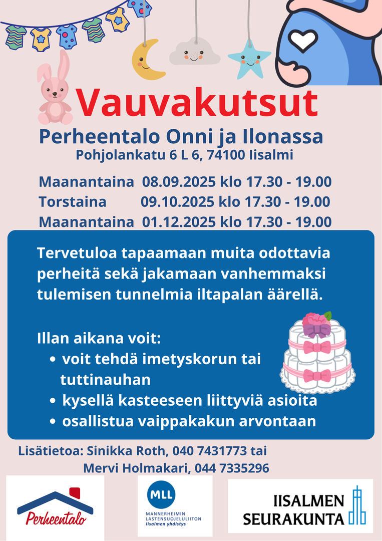 Tervetuloa seuraaville Vauvakutsulle maanantaina 8.9.2025 klo 17.30 - 19.00 Perheentalo Onni ja Ilonaan, Pohjolankatu 6 L 6. Iltaan ei tarvitse ilmoittautua. Vauvakutsuille voit tulla missä tahansa vaiheessa raskautta. Tervetuloa Vauvakutsuille joko yksin tai puolison/kumppanin tai ystävän kanssa. Tarjolla iltapalaa!