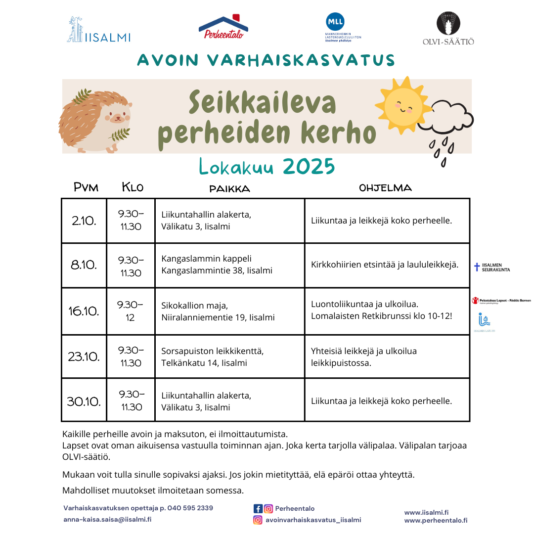 Syyslomaviikolle sattuvaan seikkailuun (16.10) on mahdollista tulla mukaan myös maksuttomalla bussikyydillä. Katso erillinen mainos ja kyytiin ilmoittautumisohje avoimen varhaiskasvatuksen tai perheentalon somesta.