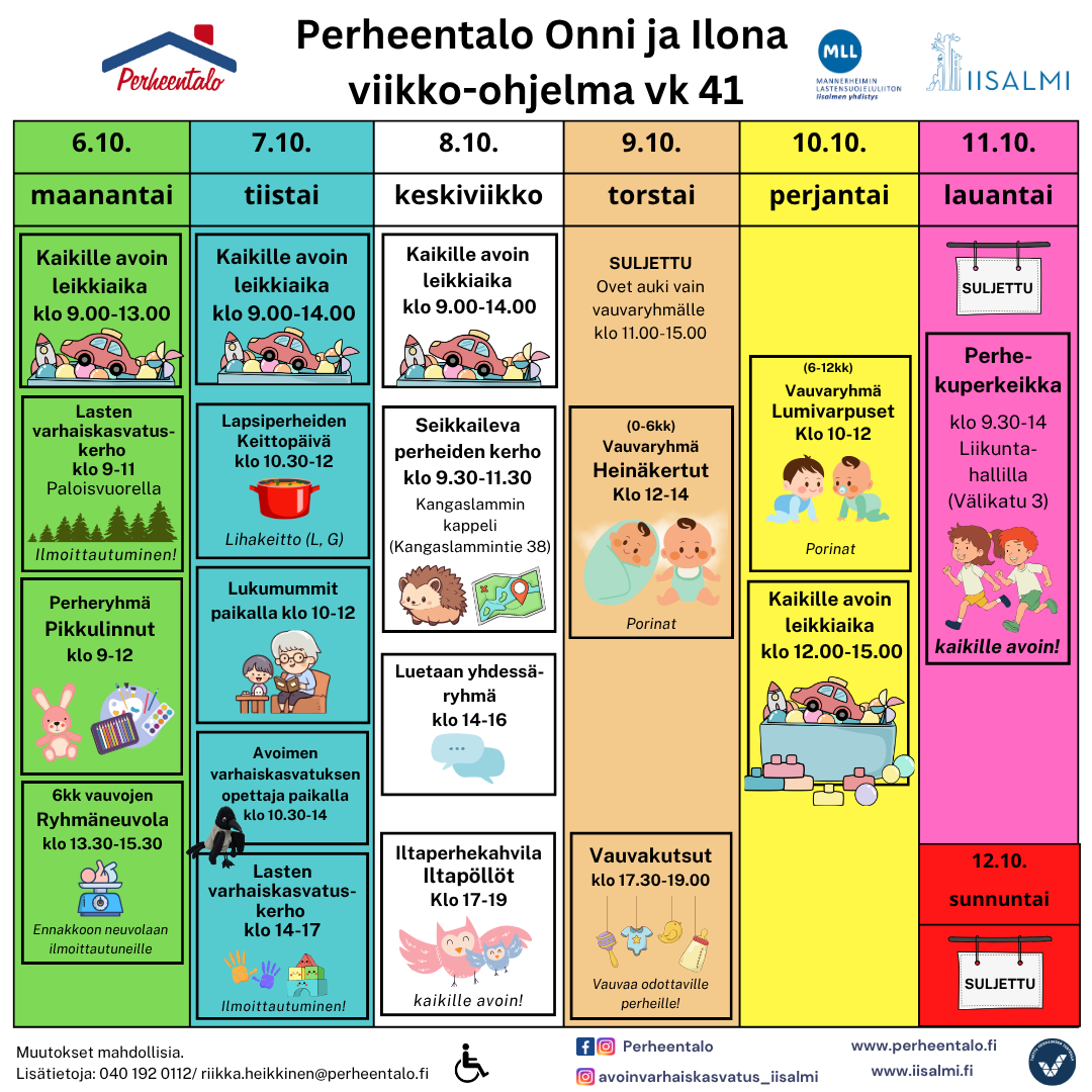 Perheryhmä Pikkulinnut klo 9-12. Perheryhmään ovat tervetulleita kaikki alle kouluikäisten lasten perheet. Vapaata yhdessäoloa ja leikkiä. Ohjattua toimintaa perheiden toiveiden mukaan. Yhteistyössä Iisalmen seurakunnan kanssa.