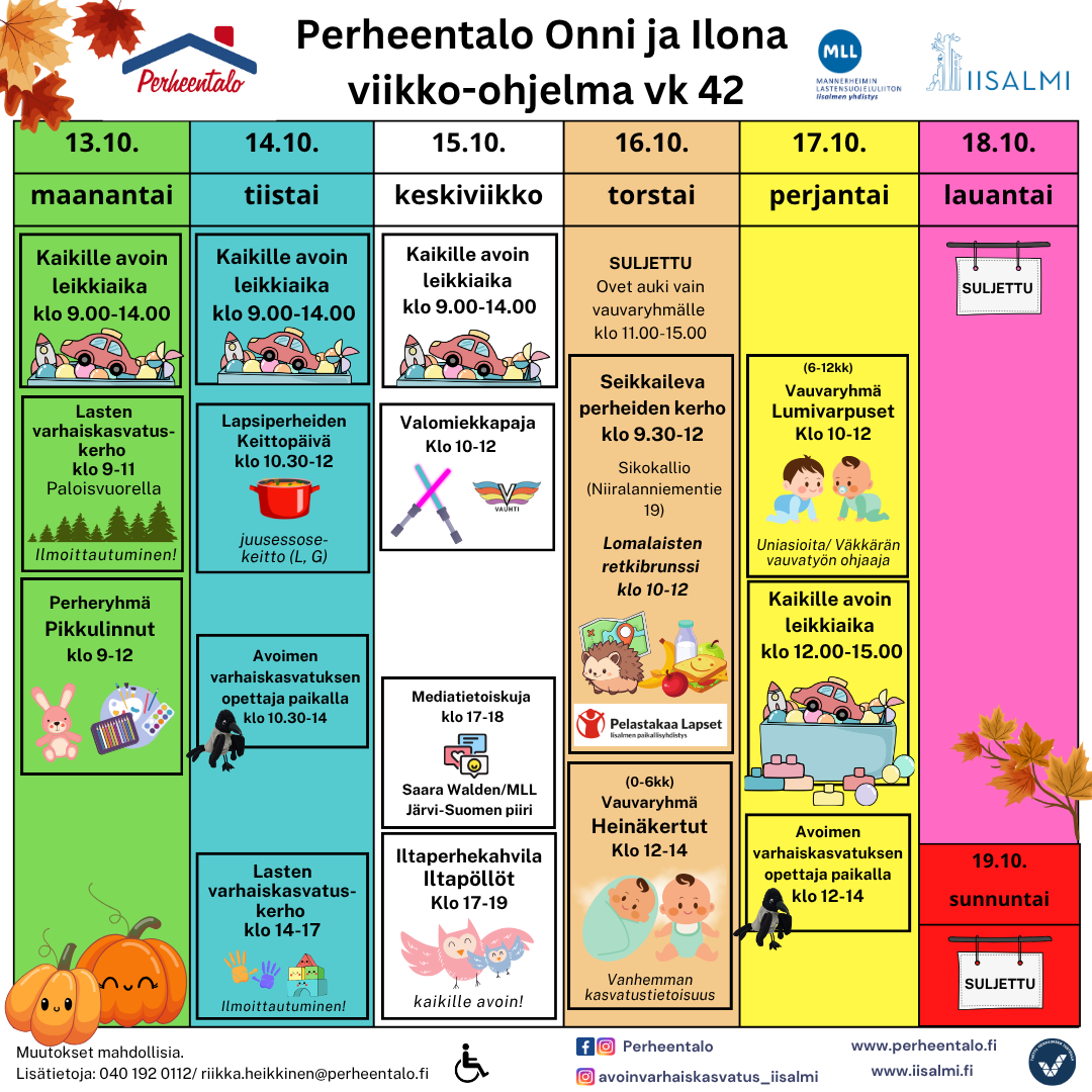 Perheryhmä Pikkulinnut klo 9-12. Perheryhmään ovat tervetulleita kaikki alle kouluikäisten lasten perheet. Vapaata yhdessäoloa ja leikkiä. Ohjattua toimintaa perheiden toiveiden mukaan. Yhteistyössä Iisalmen seurakunnan kanssa.