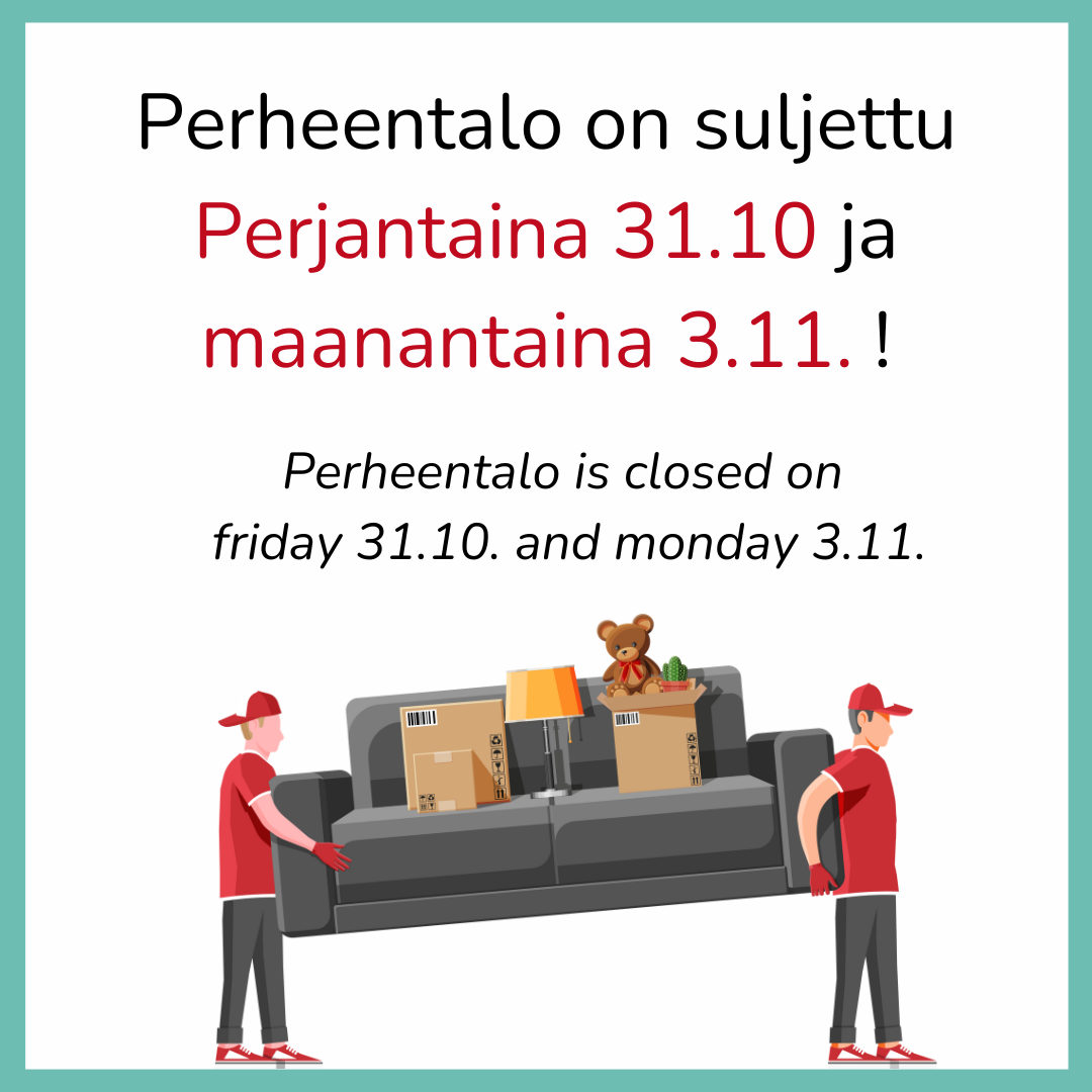 Pari päivää tarvitaan että saadaan remonttipölyt lakaistua ja tavarat siirrettyä, joten Perheentalo on suljettu perjantaina 31.10. ja maanantaina 3.11.