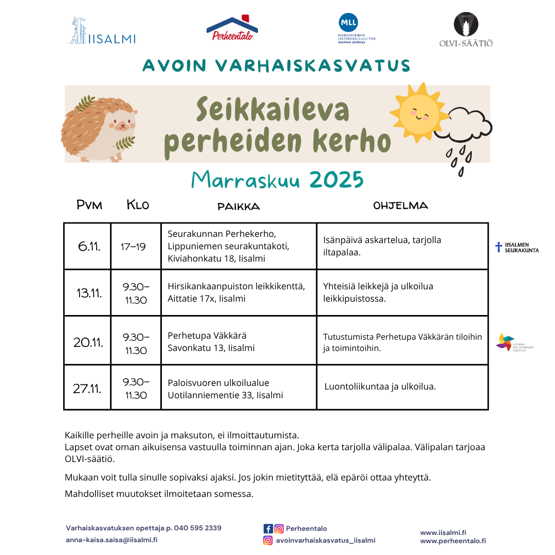 Seikkailevan perheiden kerhon marraskuun ohjelma.