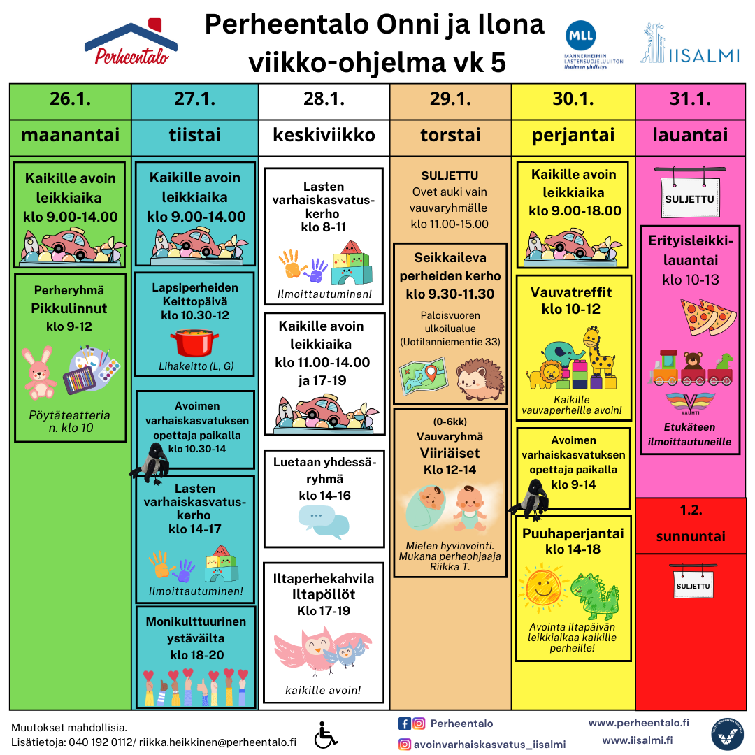 Perheryhmä Pikkulinnut klo 9-12. Perheryhmään ovat tervetulleita kaikki alle kouluikäisten lasten perheet. Vapaata yhdessäoloa ja leikkiä. Ohjattua toimintaa perheiden toiveiden mukaan. Yhteistyössä Iisalmen seurakunnan kanssa. Pöytäteatteria n. klo 10!