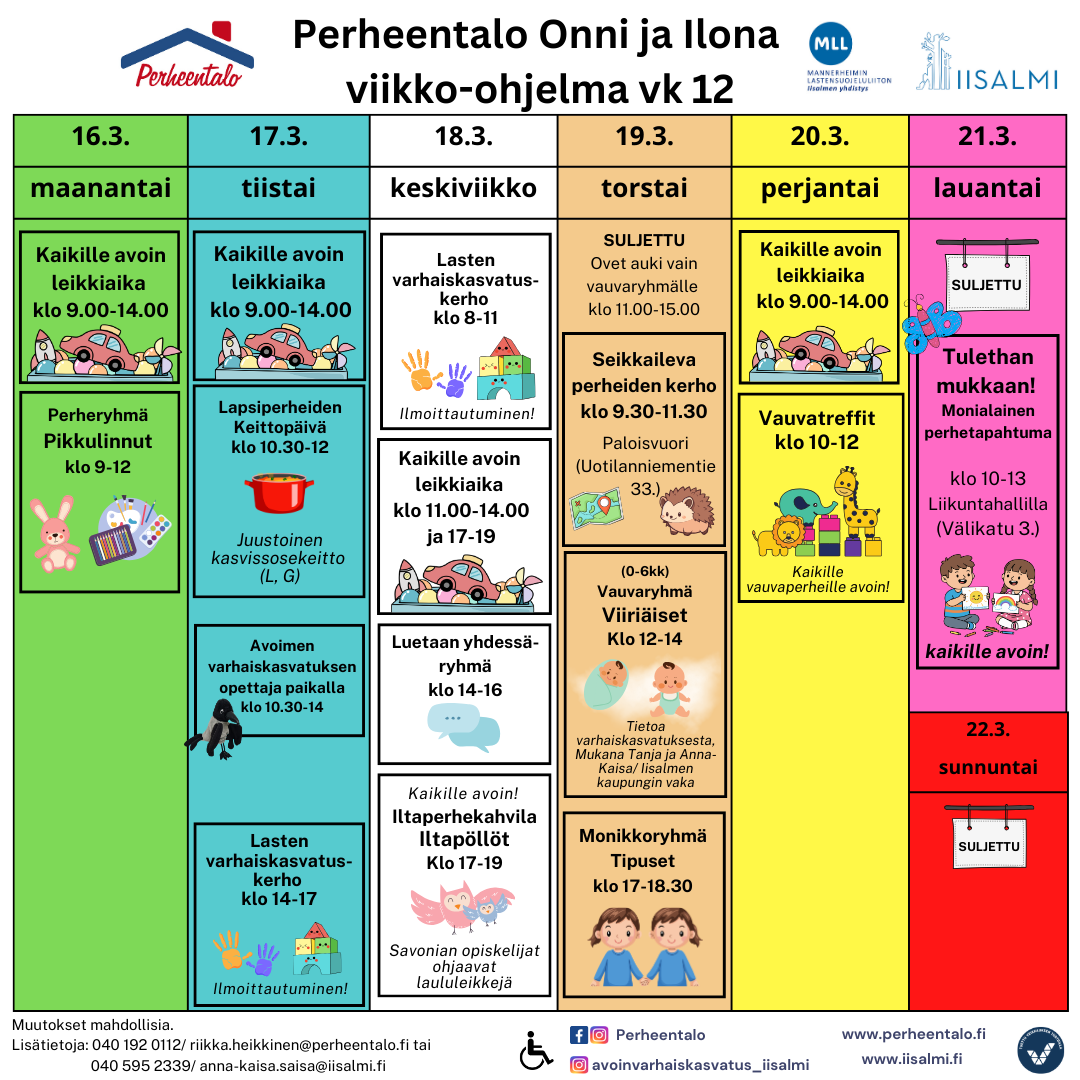 Perheryhmä Pikkulinnut klo 9–12. Perheryhmään ovat tervetulleita kaikki alle kouluikäisten lasten perheet. Vapaata yhdessäoloa ja leikkiä. Ohjattua toimintaa perheiden toiveiden mukaan. Yhteistyössä Iisalmen seurakunnan kanssa.
