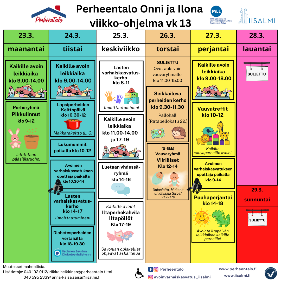 Perheryhmä Pikkulinnut klo 9–12. Perheryhmään ovat tervetulleita kaikki alle kouluikäisten lasten perheet. Vapaata yhdessäoloa ja leikkiä. Ohjattua toimintaa perheiden toiveiden mukaan. Yhteistyössä Iisalmen seurakunnan kanssa.