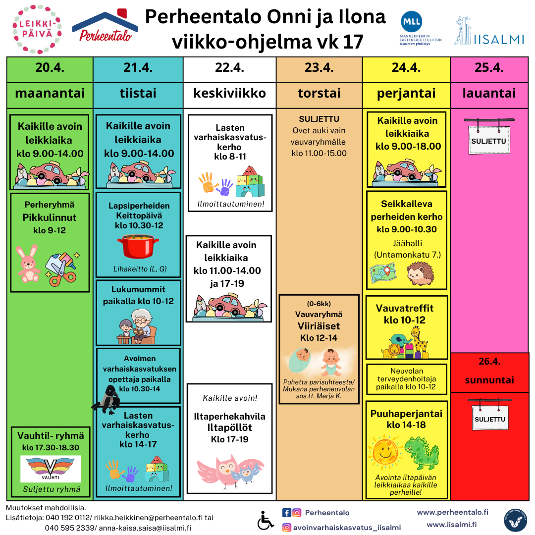 Perheentalon Puuhaperjantai klo 14–18. Perheiden toiveesta olemme lisänneet aukioloaikaa muutamaan iltapäivään. Tervetuloa mukaan! Näistä perjantaista on mukava ponkaista viikonlopun viettoon.
